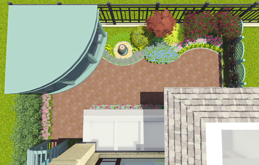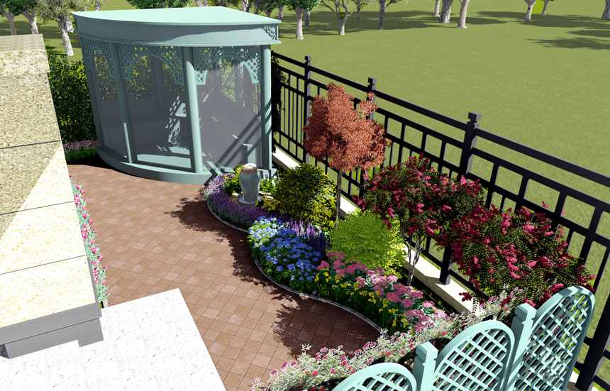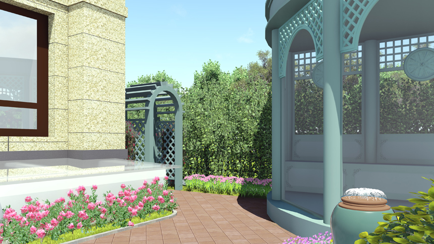 滟澜新宸东区王宅花园,,庭院面积70平米,,为小型庭院景观。。。。。。接纳欧式田园设计手法,,小又要透露出细腻。。。。。。
